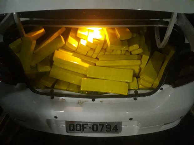 Carro alugado de modelo Renault Logan de cor branca, com placa de Belo Horizonte, Minas Gerais foi encontrado na Avenida Afonso Pena, no centro de Campo Grande, com 351 quilos de maconha no porta malas, na noite de ontem (25).