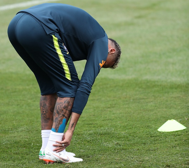 O atacante Neymar, 26, deixou o treino desta terça-feira (19) após 15 minutos de atividade. Ele sentiu dores no pé direito quando participava de uma roda de bobinho com Willian, Miranda, Thiago Silva, Coutinho e Paulinho.