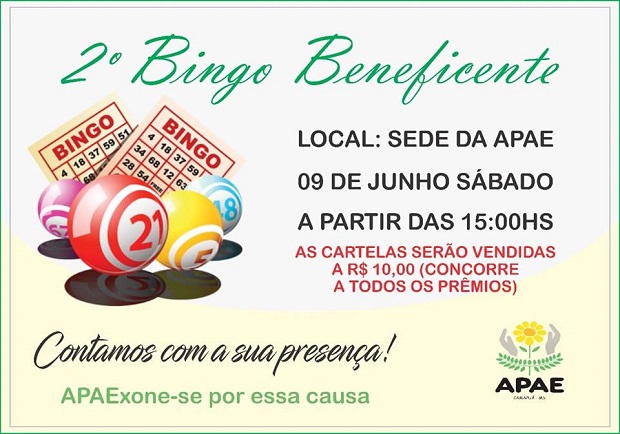 O evento será na sede da APAE e está marcado para começar as 15 horas. No local estará vendendo salgados e refrigerante. O preço da cartela será de apenas R$ 10,00 e concorrerá a todos os prêmios.