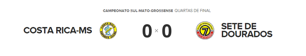 Costa Rica-MS e Sete de Dourados não saíram do zero, na tarde deste domingo (11), no estádio Laertão. Resultado favorece o time douradense, que só precisa de outro empate no jogo de volta das quartas de final para avançar à semifinal do Campeonato Sul-Mato-Grossense. Para a Cobra do Norte, só a vitória interessa na próxima partida se quiser seguir no estadual.