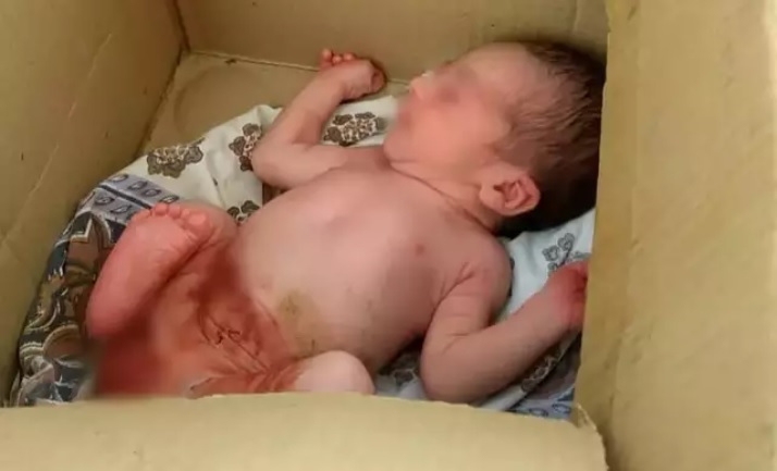 Recém-nascido ainda dentro da caixa deixada na calçada nos fundos de galpão. (Foto: Divulgação | Corpo de Bombeiros)
