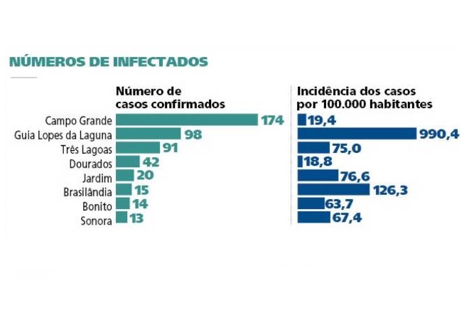 Até amanhã desta quarta-feira (13), 46 pessoas haviam sido diagnosticadas com a doença. Contudo, nesta noite além de divulgar os 6 novos resultados positivos a prefeitura do município informou que há mais 27 casos suspeitos.