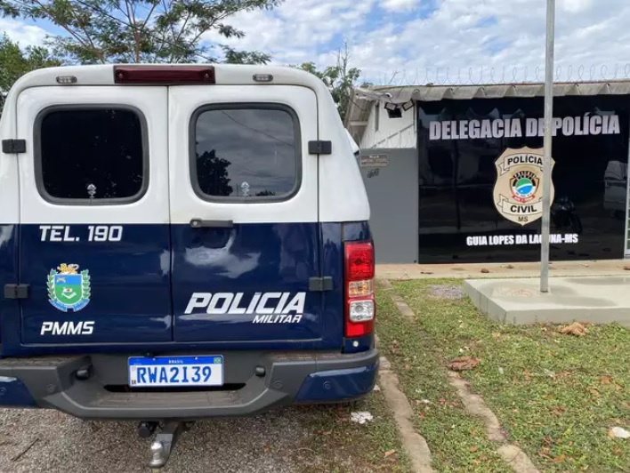 Viatura da PM em frente à delegacia de Guia Lopes da Laguna. (Foto: Jardim MS News)