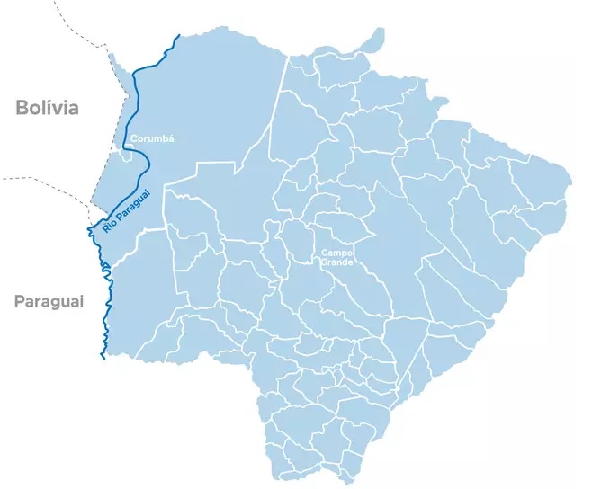 Mapa de Mato Grosso do Sul; linha pontilhada representa fronteiras e linha azul é o Rio Paraguai. (Arte: Thiago Mendes)