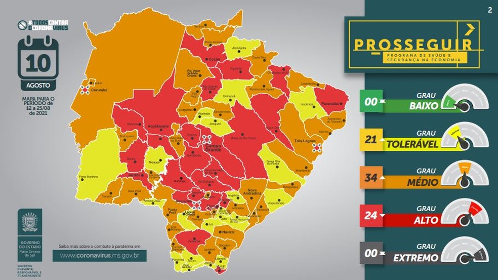 Dos 79 municípios de Mato Grosso do Sul, 24 estão enquadrados com grau alto – bandeira vermelha – na classificação de risco para a pandemia de Covid-19 do programa Prosseguir, do governo do estado, que foi divulgada nesta terça-feira (10). O novo mapa situacional entra em vigor nesta quinta-feira (12) e vale até o dia 25 de agosto.