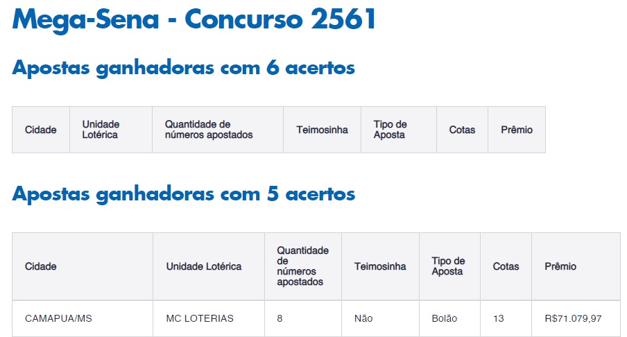 Duas apostas vencedoras são de Campo Grande. Uma delas levou R$80.009,32 e foi feita na Lotérica Gato Que Ri. A outra sortuda faturou os R$40 mil e foi registrada no aplicativo da Caixa.