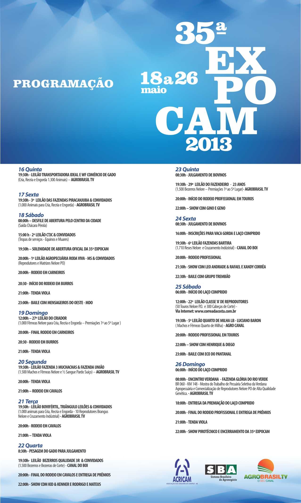 A 35ª Expocam (Exposição Agropecuária de Camapuã) começará neste sábado (18), com diversas atrações musicais, laço comprido, bailes, cavalgadas, leilões e rodeios, a feira agropecuária é uma das mais tradicionais do Estado. A Exposição se tornou referencia nacional quando o assunto é leilão de gado nelore, fazendo com que Camapuã recebesse o título de “Capital do Bezerro de Qualidade”.