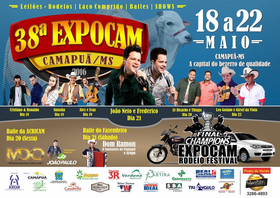 Está chegando o evento mais aguardado de Camapuã! De 18 á 22 de maio acontece a 38ª Expocam (Exposição Agropecuária de Camapuã), com muitos shows, bailes, laço comprido, praça de alimentação, parque de diversões, leilão e rodeios.