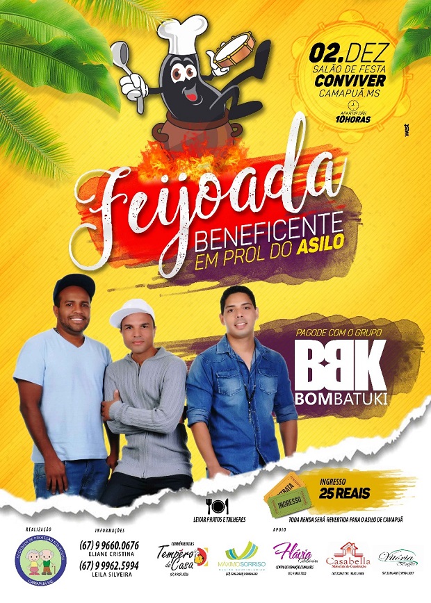 No dia 02 de dezembro o Asilo de Camapuã juntamente com a colaboradora Leila Silveira estarão realizando uma deliciosa feijoada com pagode. O grupo que será responsável por animar o almoço será o grupo “Bombatuki”. O almoço será no conviver, a partir das 10h, o valor do ingresso será de R$ 25,00, levar pratos e talheres.