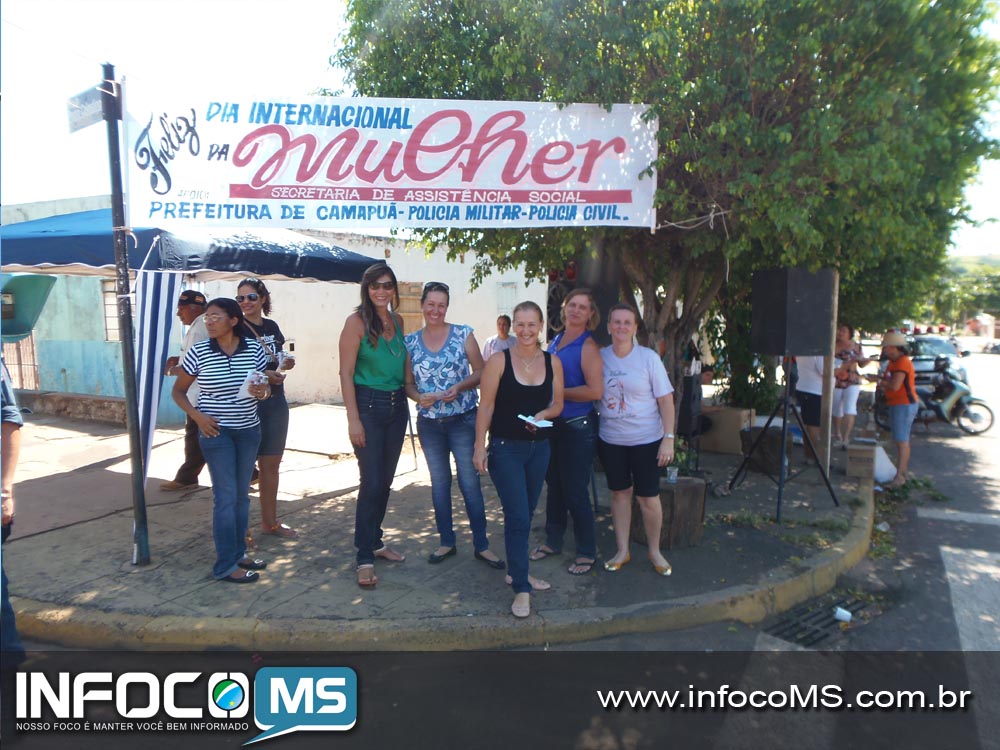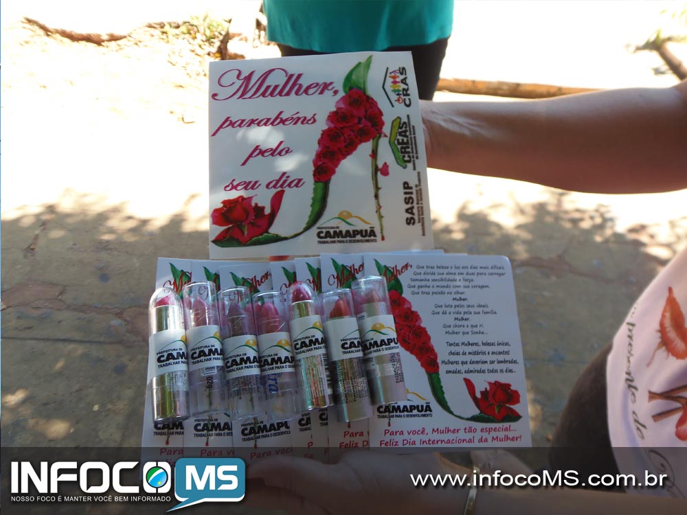 A Secretaria Municipal de Assistência Social e Inclusão Produtiva (SASIP) em parceria com o Centro de Referencia Especializado de Assistência Social (CREAS) e o Centro de Referência de Assistência Social (CRAS) com o apoio da Prefeitura de Camapuã estão realizando nesta sexta-feira (8) uma animada Blitz no centro de Camapuã em comemoração ao Dia Internacional da Mulher.