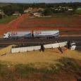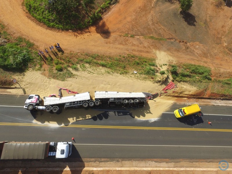 Uma Scania bitrem, com placas de Guarapuava (PR), tombou na manhã desta quinta-feira (08), no quilometro 547 da BR-163, em Bandeirantes, região norte de Mato Grosso do Sul.