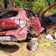 O veículo ficou totalmente destruído com o capotamento e o impacto na arvore.