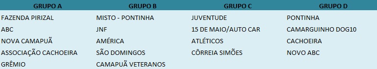 A competição que tem por finalidade arrecadar alimentos para serem doados ás famílias carentes de Camapuã terá 4 grupos, sendo dois com 5 equipes e outros 2 com 4 equipes, os times se enfrentarão dentro de suas respectivas chaves, classificando as duas melhores equipes de cada grupo. Confira como ficaram os grupos.