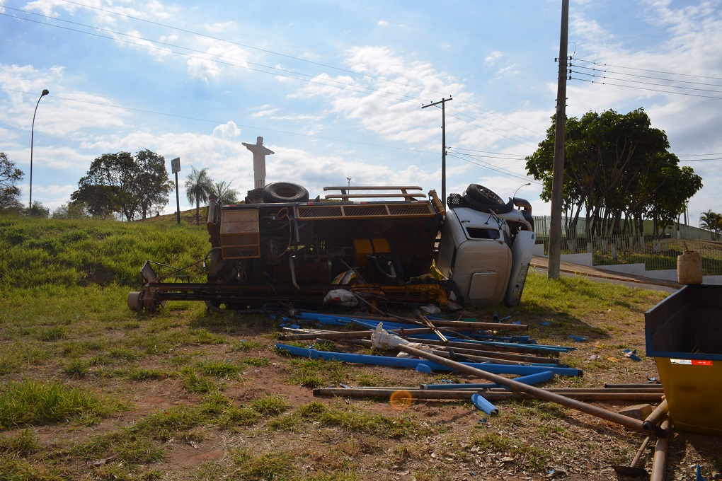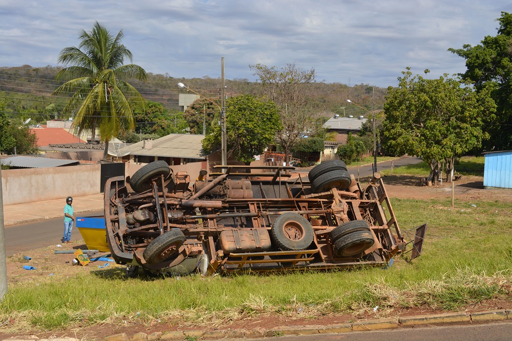 Na tarde desta quinta-feira (03), por volta das 13h30, um caminhão Mercedes branco, com placas de Campo Grande, que faz instalação de poços artesianos, tombou próximo ao parque poliesportivo do estudante, no bairro Cophavale (BNH), em Camapuã.