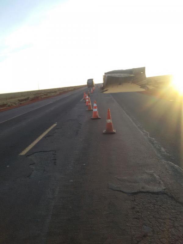 Na manhã da ultima quarta-feira (19) uma carreta IVECO carregada de grãos seguia de Camapuã a Chapadão do Sul, quando em uma subida, no KM 167 da BR-060 um carro popular tentou o ultrapassar e no sentido contrário vinha outro carro, para evitar um acidente ainda pior, o motorista da carreta freou. Com o movimento brusco, acabou totalmente o freio da carreta e a mesma começou a descer.