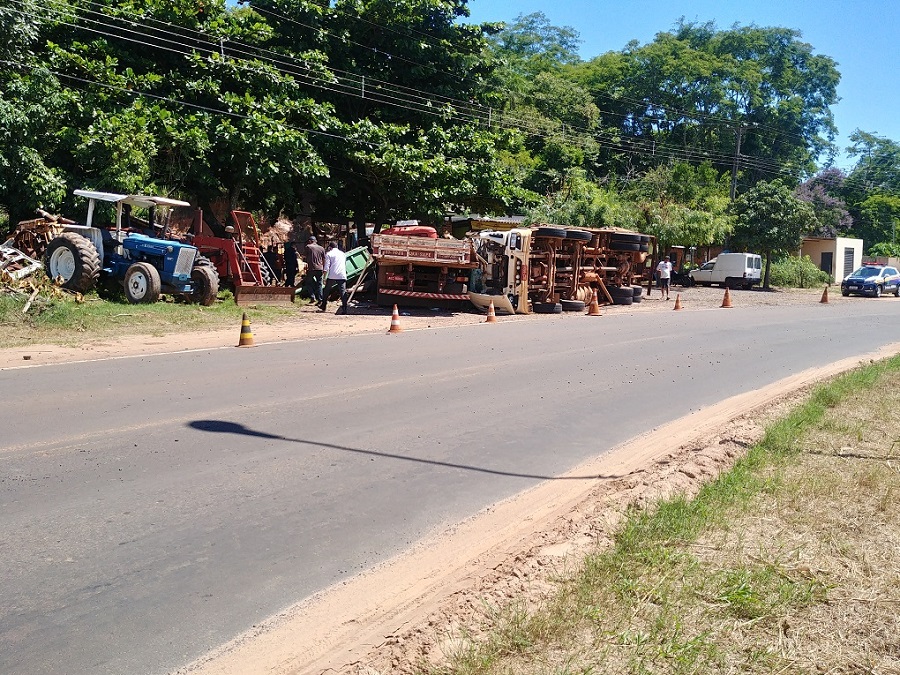 Na manhã desta quinta-feira (31), por volta das 10h, uma carreta Iveco carregada com defensivos agrícolas, tombou na curva do km 196 da BR-060 em Camapuã e bateu em dois veículos.