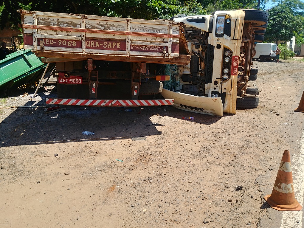 A carreta não conseguiu fazer a curva e tombou, se arrastando já fora do asfalto e batendo em um caminhão Mercedes vermelho, placa AEC-9068 de Campo Grande-MS, que estava estacionado em frente um Bar, o motorista, Sr. Cezar Siqueira da Silva de 43 anos, tinha parado para comprar cigarro e quando estava voltando, viu a carreta bater em seu caminhão e arrastando por cerca de 20 metros.