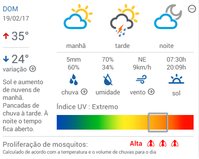 De acordo com o site Clima Tempo, a previsão para esta sexta feira (17) é de sol com aumento de nuvens pela manhã, com pancadas de chuva à tarde e à noite. A temperatura máxima deve ficar em 34ºC, a probabilidade de chuva é de 60% com volume estimado em 07mm.