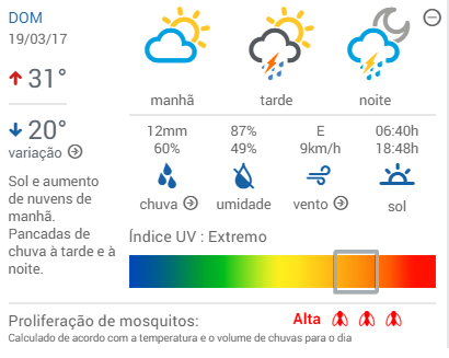 De acordo com o site Clima Tempo, a previsão para esta sexta feira (17) é de sol com muitas nuvens, períodos nublados, com chuva a qualquer hora. A temperatura máxima deve ficar em 30ºC, a probabilidade de chuva é de 67% com volume estimado em 17mm.