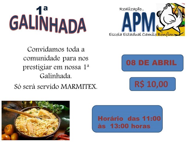 A escola estadual Camilo Bonfim localizada na rua dos Jesuítas 965 centro, convida a todos para uma deliciosa galinhada, que será no dia 08 de abril.