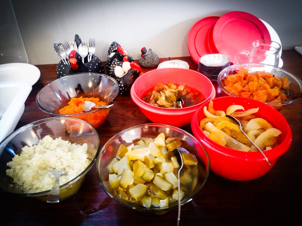 São vários tipos de pratos, saladas e vários cortes de carne assada, além de uma deliciosa sobremesa com doces caseiros.