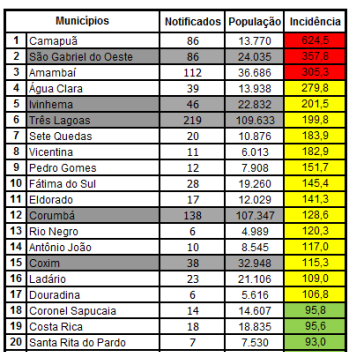 Os dados do boletim são referentes a semana 11 que vai dos dias 12 a 18 de março, onde Camapuã segue no topo de incidências, registrando 86 casos notificados, em uma população de 13.770 habitantes, o que gera uma incidência de 624,5 casos a cada 100 mil habitantes. A SES considera de alta incidência os casos acima de 300 notificações a cada 100 mil habitantes.