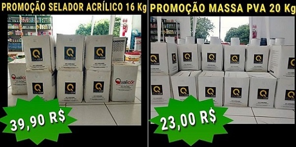 A unidade com 16kg de Selador Acrílico está pelo preço de R$ 39,90 e a unidade de Massa PVA com 20kg está por R$ 23,00, a promoção será enquanto durar o estoque.