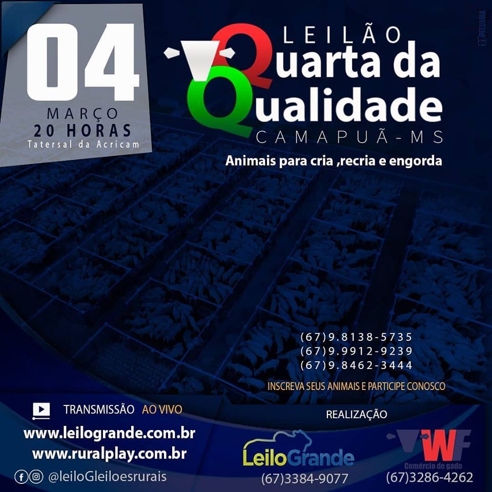 A WF Comércio de Gado, juntamente com a Leilogrande Leilões Rurais, realizará nesta quarta-feira (4), mais um leilão de gado de corte em Camapuã-MS, a Capital do Bezerro de Qualidade.