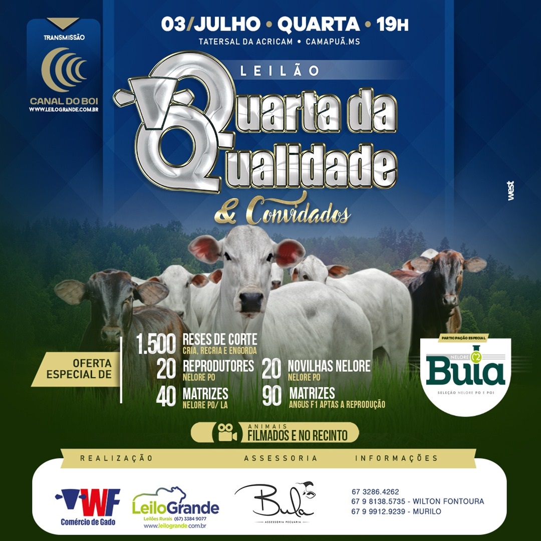 A WF Comércio de Gado, juntamente com a Leilogrande Leilões Rurais, realizará nesta quarta-feira (3), mais um leilão de gado em Camapuã.