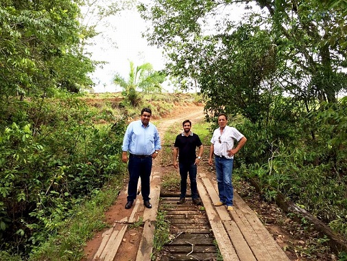 Próximo a Fazenda Mitaporã, onde passa uma estrada que serve com linha de transporte de alunos, Delano, o secretário e o diretor puderam constatar as péssimas condições da ponte.