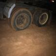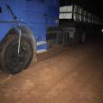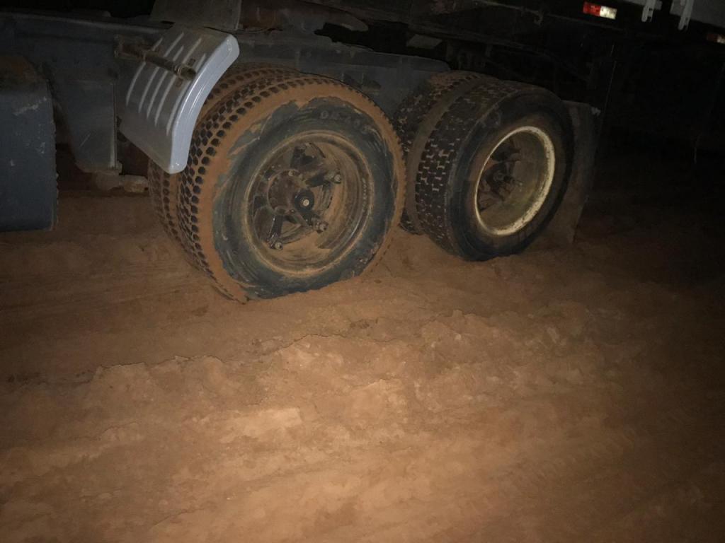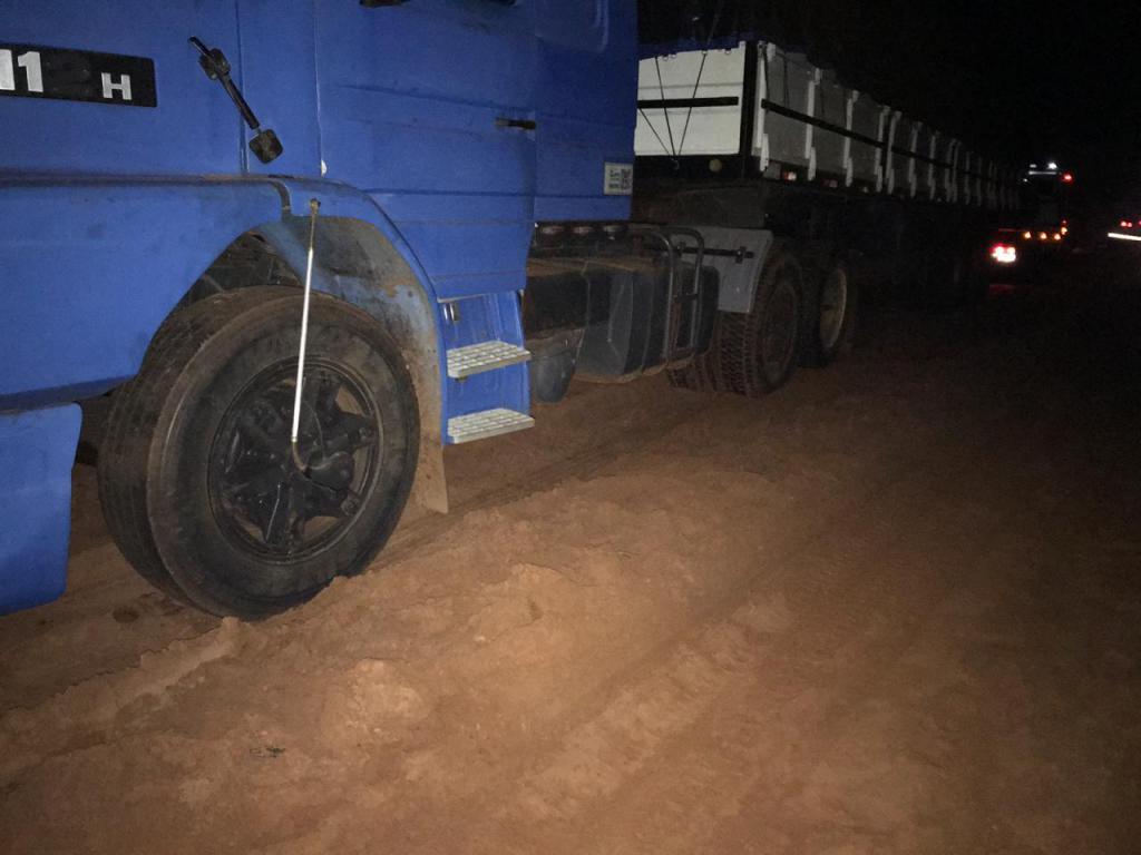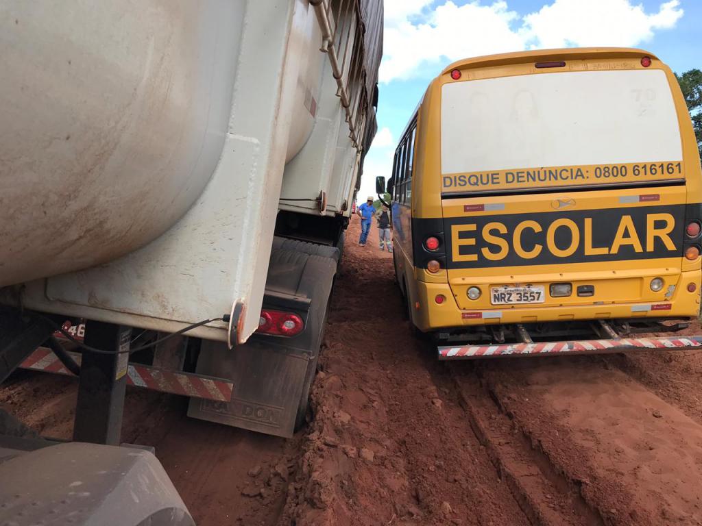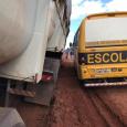 Transporte escolar de Camapuã atolado ao lado de uma carreta carregada de soja - Foto: WhatsApp/InfocoMS