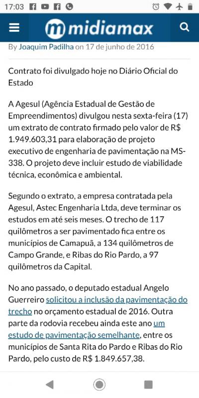 Segundo o extrato, a empresa contratada pela Agesul, Astec Engenharia Ltda, deveria terminar os estudos em até seis meses. O trecho de 117 quilômetros a ser pavimentado fica entre os municípios de Camapuã, a 134 quilômetros de Campo Grande, e Ribas do Rio Pardo, a 97 quilômetros da Capital. Até hoje a obra não foi iniciada.