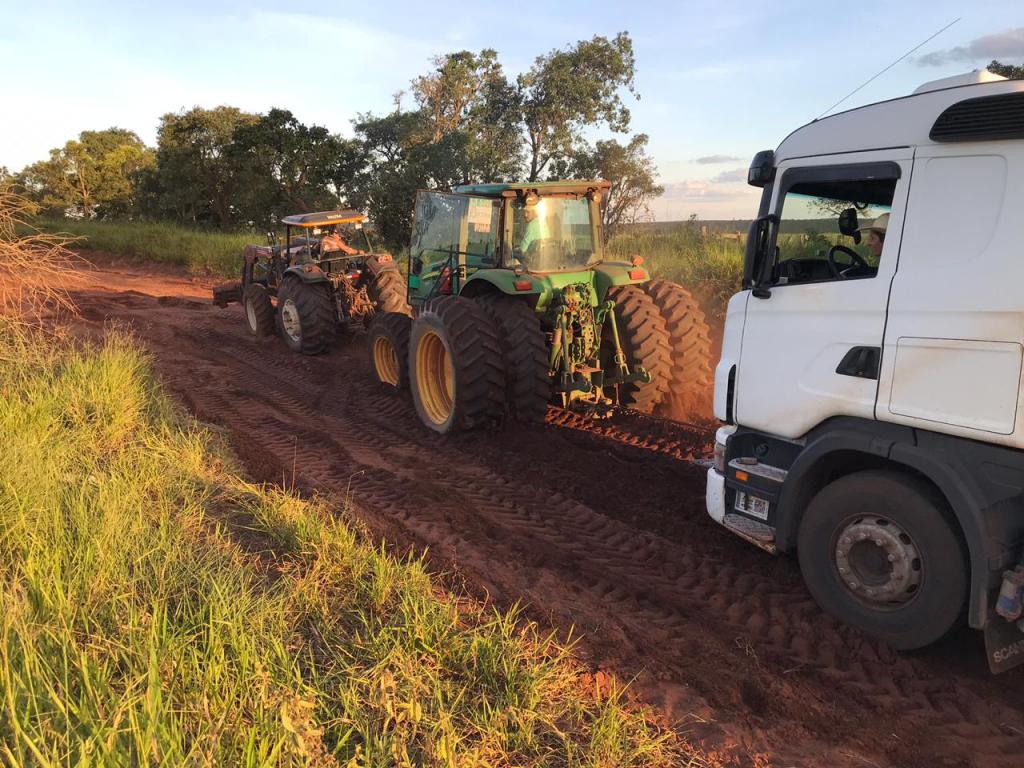 Carreta carregada de soja sendo rebocada por dois tratores na MS-338 a 20km de Camapuã - Foto: WhatsApp/InfocoMS