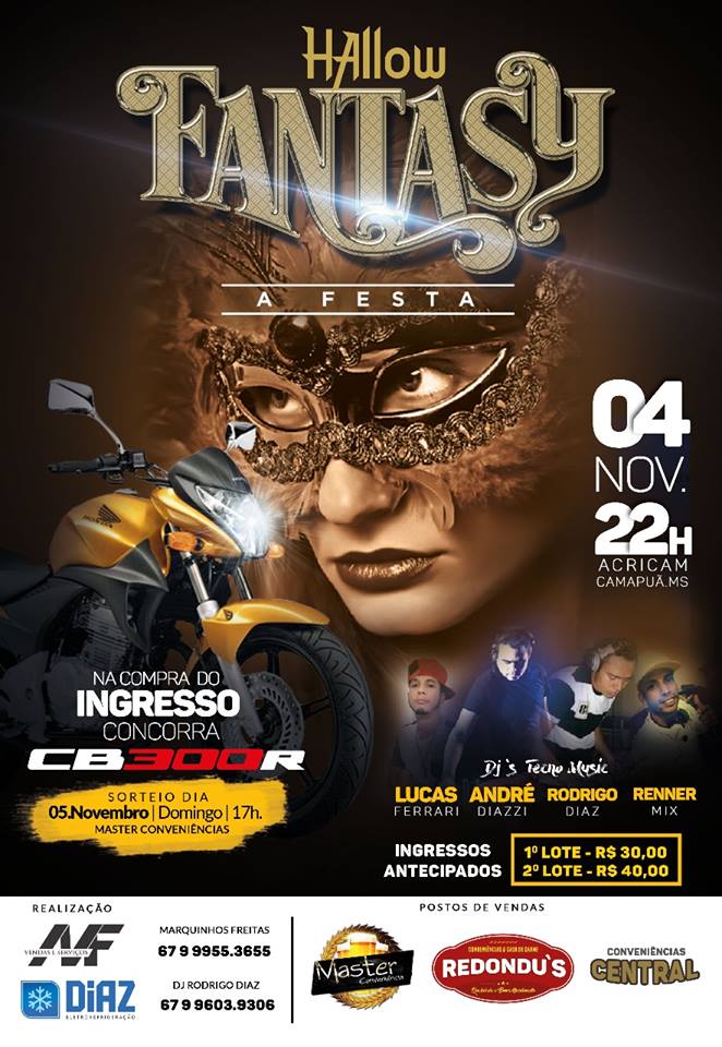 Hallow Fantasy, acontece no dia 04 de novembro, no salão da Acricam, em Camapuã e terá sorteio de uma moto CB 300 Honda.