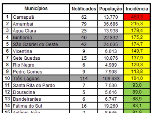Os dados do boletim são referentes a semana 7 que vai dos dias 12 a 18 de fevereiro, onde Camapuã segue no topo de incidências, registrando 62 casos notificados, em uma população de 13770 habitantes, o que gera uma incidência de 450,3 casos a cada 100 mil habitantes, número maior que o dobro do município que ocupa o segundo lugar (Amambai, 215,3). A SES considera de alta incidência os casos acima de 300 notificações a cada 100 mil habitantes, Camapuã é o único município enquadrado nesta classificação.