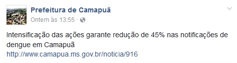 Se por um lado o Boletim do Governo do Estado divulgado na quarta-feira (22) mostra o aumento nas incidências, a Prefeitura de Camapuã divulgou no mesmo dia que houve redução de 45% nas notificações conforme matéria publicada no portal do município.