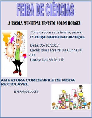 A direção da E. M. Ernesto Sólon Borges, tem o prazer em convidar toda a população para a 1ª feira cientifica cultural, que será realizada nas dependências do colégio, com endereço: Rua Ferreira da Cunha nº 200 vila diamantina.