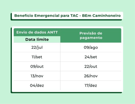O Ministério do Trabalho prevê que os profissionais devem estar com a Carteira Nacional de Habilitação (CNH) e o CPF válidos. As informações de cadastro dos profissionais foram repassadas pela Agência Nacional de Transportes Terrestres (ANTT) do Ministério da Infraestrutura (Minfra) e estão em processamento pela Dataprev.