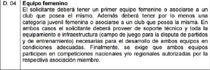 – O solicitante (à licença) deverá ter uma primeira equipe feminina ou associar-se a um clube que possua o mesmo. Além do mais, deverá ter pelo menos uma categoria juvenil feminina ou associar-se a um clube que possua. Em ambos os casos, o solicitante deverá prover de suporte técnico e todo o equipamento e infraestrutura (campo de jogo para a disputa de jogos e treinos) necessária para o desenvolvimento de ambas as equipes em condições adequadas. Finalmente, se exige que ambos os times participem de competições nacionais e regionais autorizadas pela respectiva associação membro – prevê o regulamento.