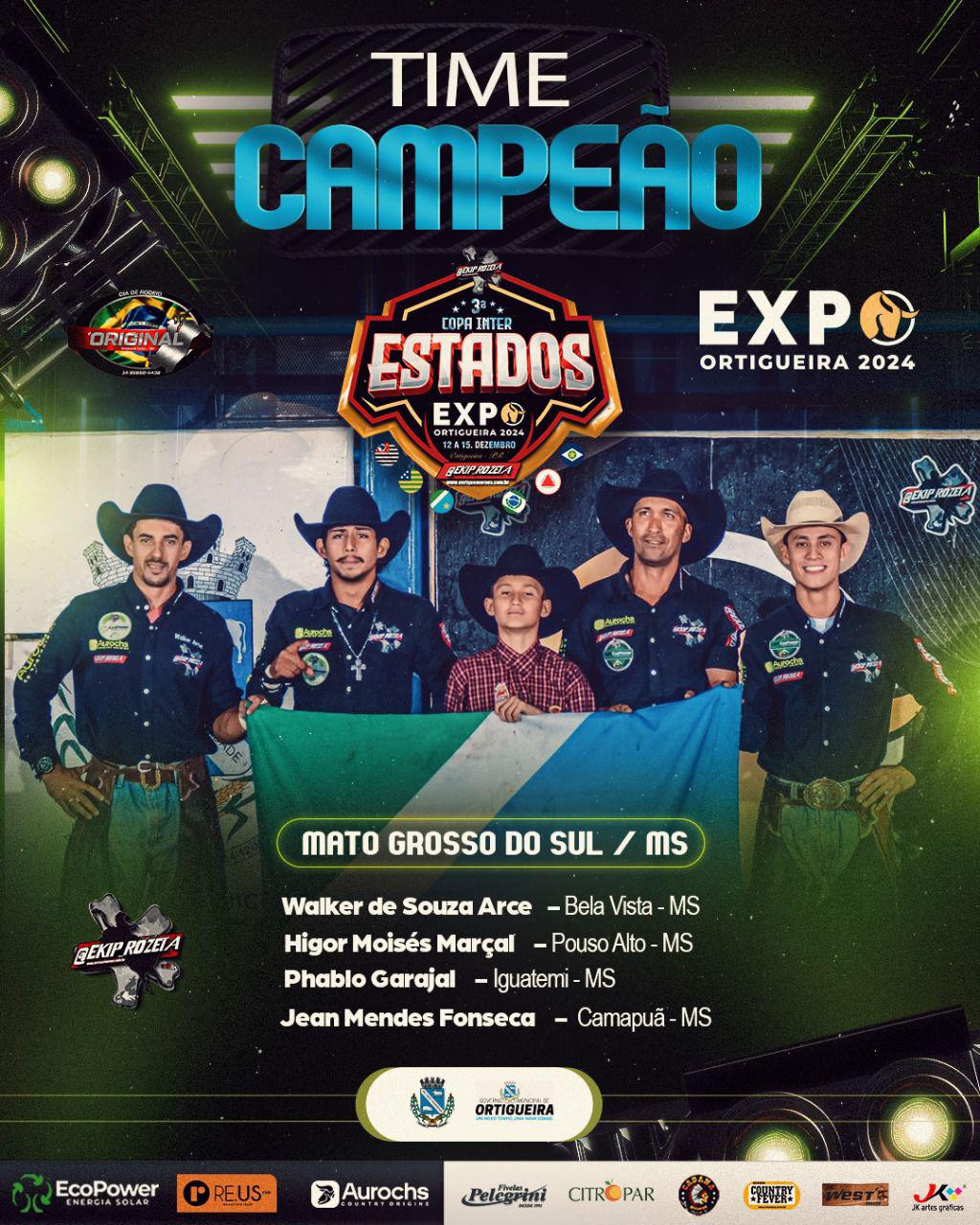 Com peão de Camapuã, cidade a 140km de Campo Grande, a equipe de Mato Grosso do Sul sagrou-se campeã da 3ª Copa Inter Estados de rodeio em touros, na cidade de Ortigueira-PR, durante a Expo Ortigueira 2024. O evento aconteceu no último final de semana, de 12 a 15 de dezembro.