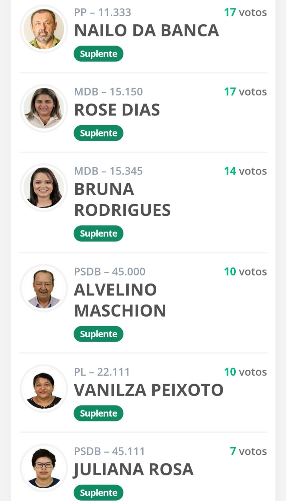 Os vereadores eleitos pela primeira vez foram, o policial civil Hélio do DEM com 359 votos, professor Jean do PSDB com 338 votos, Marquinhos Moreira do PL com 273 votos, Ademar Laurinho do PP com 266 votos e Jerson Junior do PP com 199 votos. Completando os 9 vereadores, foi eleito o ex-vereador Dr. José Dias do MDB com 371 votos, o mais votado entre eles.