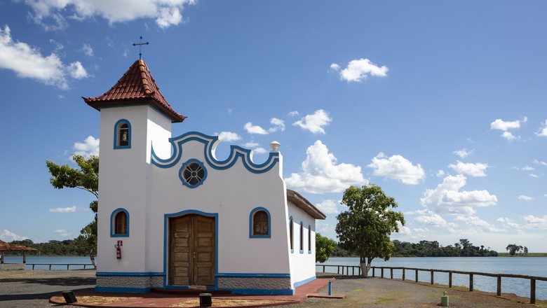 Igreja dentro da Fazenda Roncador, com lago ao fundo. (Foto: Fernando Martinho)