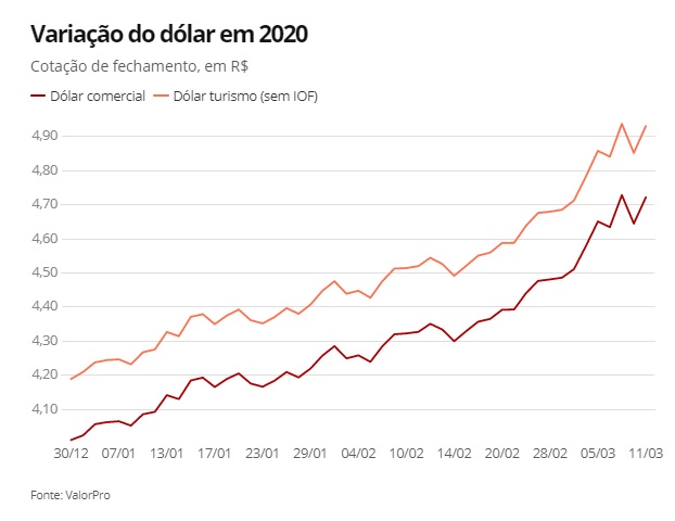 O dólar abriu em forte alta nesta quinta-feira (12), batendo R$ 5 pela 1ª vez, com os mercados de olho nos impactos do coronavírus na atividade econômica mundial, após a Organização Mundial de Saúde (OMS) ter classificado o surto como uma pandemia ed epois que o presidente norte-americano, Donald Trump, proibiu viagens da Europa para os Estados Unidos por 30 dias.