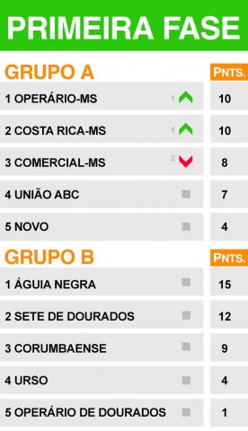 Não por acaso as duas equipes também têm os melhores ataque e defesa. O Águia Negra marcou 15 gols e o Sete de Setembro sofreu apenas dois. Já os piores ataque e defesa também são do grupo B. O Urso marcou apenas dois gols e o Operário de Dourados sofreu 17 em seis jogos.