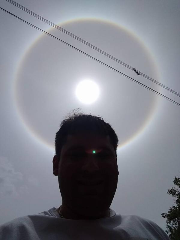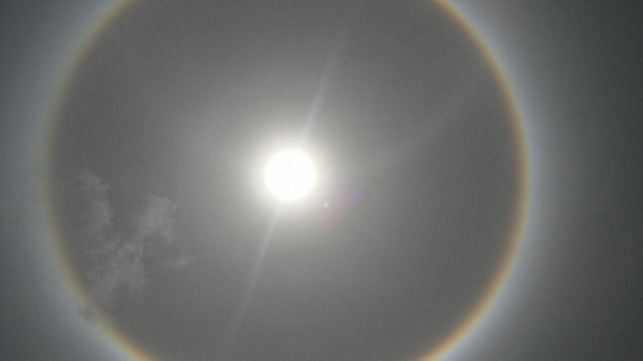 Um fenômeno chamado halo solar, círculo que se forma em torno do sol, chamou a atenção dos moradores de Camapuã-MS nesta terça-feira (3). Vários internautas registraram fotos que mostram uma espécie de arco-íris circular.