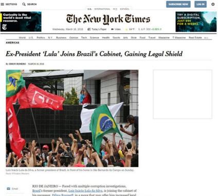 O americano "The New York Times" afirma que Lula assume o posto "num movimento que pode oferecer a ele mais proteções legais, mas que intensifica a revolta política no maior país da América Latina".