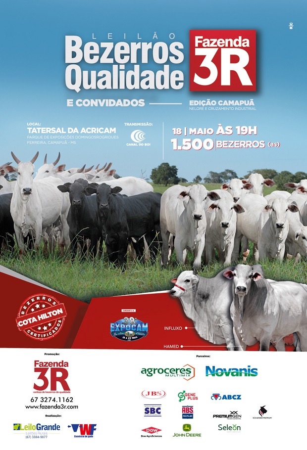A Fazenda 3R, realiza nesta quarta-feira (18) no Tatersal da Acricam, o Leilão Bezerro de Qualidade 3R. O leilão acontecerá no dia que marca o início oficial da 38ª Expocam (Exposição Agropecuária de Camapuã).