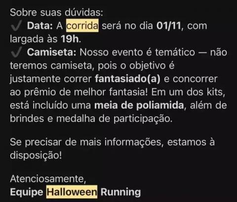 Uma moradora de Camapuã, a 145 km da Capital, contou que se inscreveu em junho, depois de ver o anúncio patrocinado no Instagram. Ela pagou cerca de R$ 70 pelo kit e recebeu um único e-mail no dia 21 de junho, confirmando a inscrição. Na mensagem, os organizadores informavam que não haveria camiseta, já que a proposta era correr fantasiado e concorrer ao prêmio de melhor fantasia. Também prometiam meia de poliamida, brindes e medalha de participação.