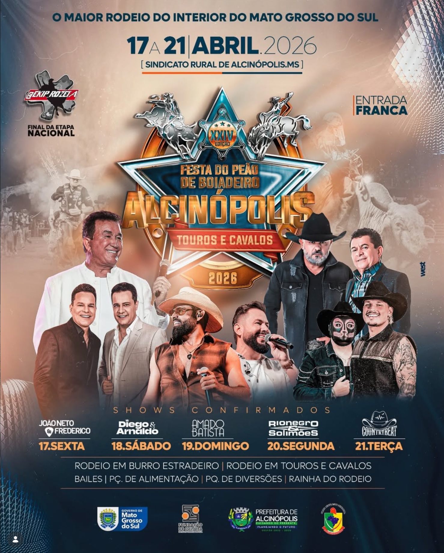 Alcinópolis já conta os dias para receber um dos maiores e mais tradicionais eventos do calendário sul-mato-grossense. De 17 a 21 de abril de 2026, o município será palco da XXIV Festa do Peão de Boiadeiro, considerada o maior rodeio do interior de Mato Grosso do Sul. O evento acontece no Sindicato Rural de Alcinópolis e terá entrada franca durante todos os dias.