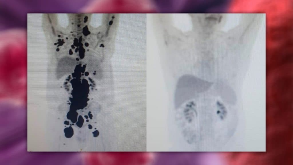 As duas imagens acima, do Pet Scan (tomografia feita com um contraste especial), representam “dois Paulos”. A da esquerda, o paciente que tinha como caminho único os cuidados paliativos, quando a alternativa é dar conforto, mas já sem expectativa de cura. E a da direita, um paciente com um organismo já sem tumores após o tratamento com CAR-T Cell.
